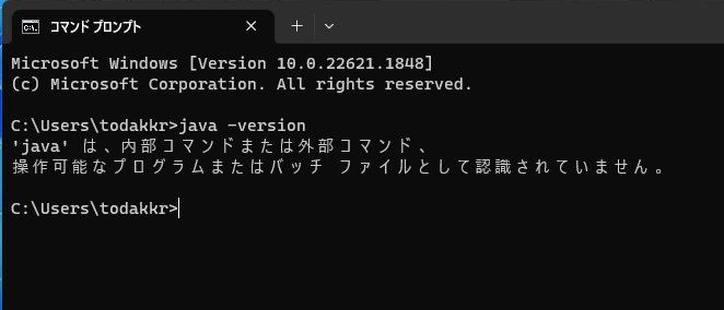 java -versionJavaがインストール済みの場合、このコマンドを入力することで何かしらバージョン情報が表示されますが、インストールされていない状態だと以下のように
