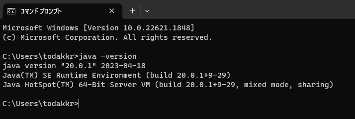 Windowsのコマンドプロンプトを開き、再び「java -version」のコマンドを実行します。