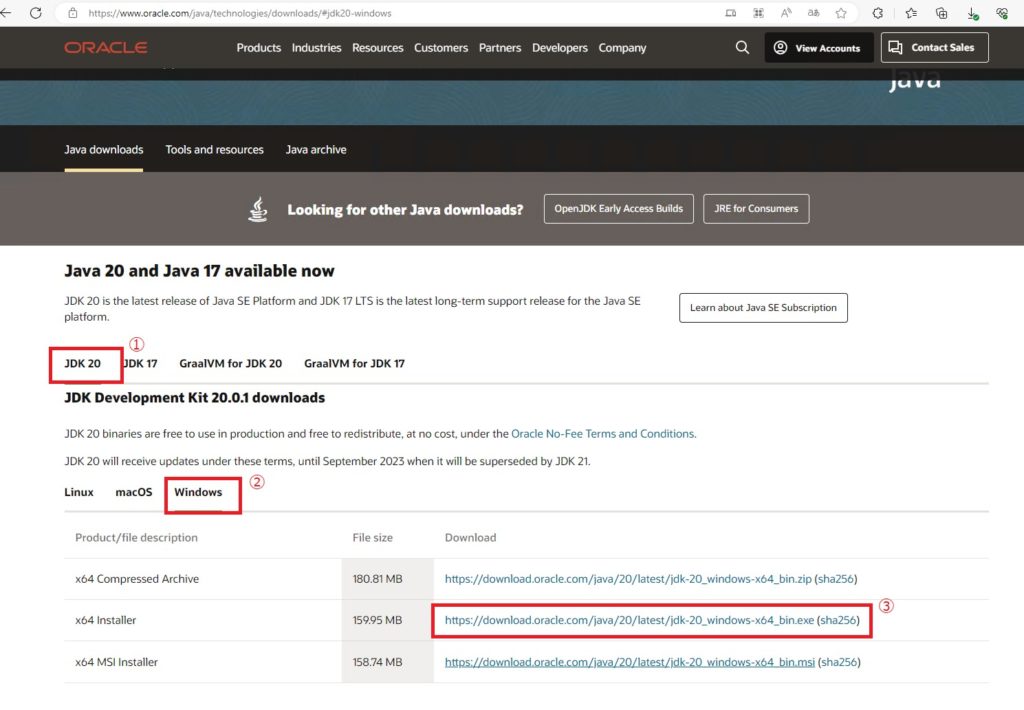 今回はJavaのバージョン20をダウンロードします。