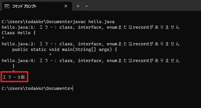 }ファイルを修正して保存できましたら、再び「javac」コマンドでコンパイルを行います。