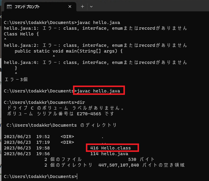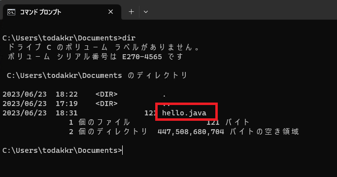 そして、dirコマンドでファイルリストを表示してみると「Hello.class」というファイルが新しく追加されているのが確認できます。