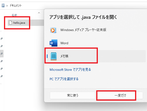 「常に使う」を選ぶと、今後Javaファイルを開くアプリを聞いてこなくなります。