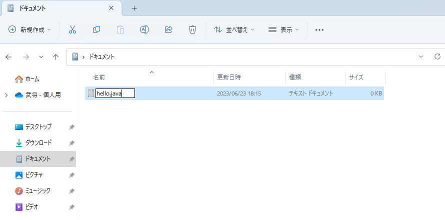 ファイル名を「新規 テキスト ドキュメント.txt」から「hello.java」変更します。
