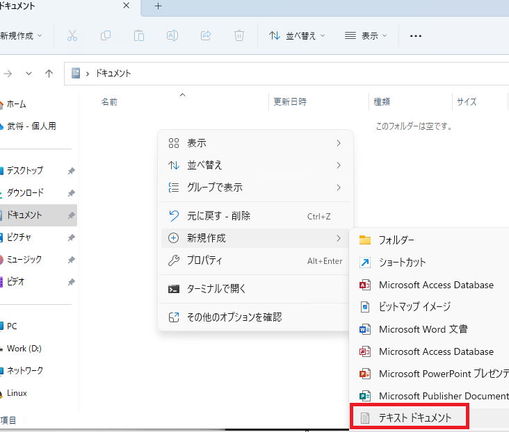ですので、ファイルの作成は「テキストドキュメント」を新規作成してから